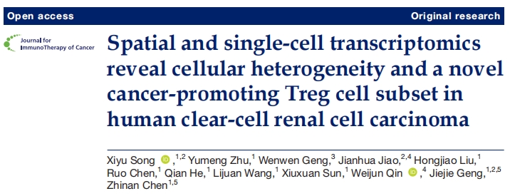 Song X, et al. Spatial and single-cell transcriptomics reveal cellular heterogeneity and a novel cancer-promoting Treg cell subset in human clear-cell renal cell carcinoma. J Immunother Cancer. 2025 13(1):e010183.