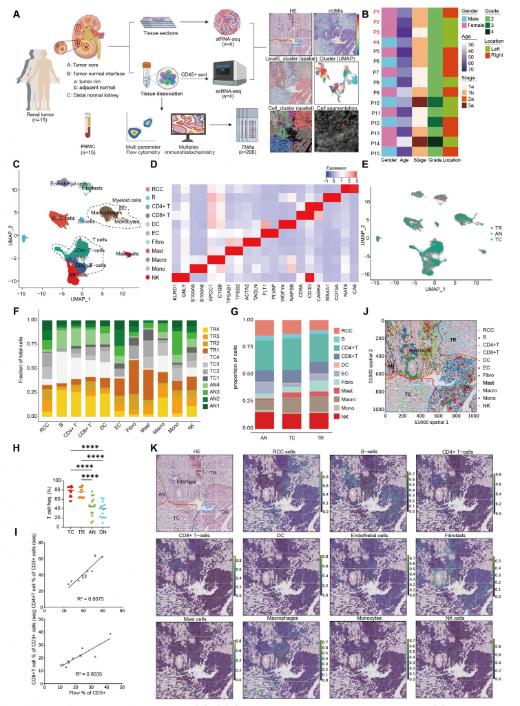 組別設(shè)計(jì):實(shí)驗(yàn)組4名ccRCC患者樣本進(jìn)行單細(xì)胞轉(zhuǎn)錄組測序&空間轉(zhuǎn)錄組測序,驗(yàn)證組15名ccRCC患者樣本進(jìn)行流式細(xì)胞術(shù)&多重免疫熒光染色,151名ccRCC患者組織樣本&40名其他腎癌亞型患者組織樣本&6名捐獻(xiàn)者健康腎組織進(jìn)行多重?zé)晒饷庖呓M化染色。