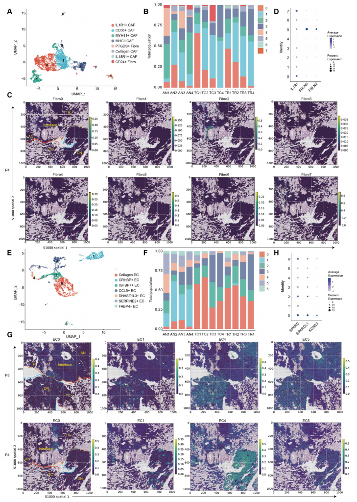 scRNA-seq與空間數(shù)據(jù)均顯示,ccRCC存在8種激活的成纖維細(xì)胞簇,腫瘤區(qū)域成纖維細(xì)胞數(shù)量高于健康組織,其中CD24+IL32+成纖維細(xì)胞顯著富集在腫瘤區(qū)域,PTGDS+成纖維細(xì)胞幾乎全分布在AN,高表達(dá)ECM(胞外基質(zhì))形成和EMT的成纖維細(xì)胞簇在IF較為富集,IL1R1+?CAF(腫瘤相關(guān)成纖維細(xì)胞)表現(xiàn)出腫瘤促進(jìn)表型;7種EC(內(nèi)皮細(xì)胞)簇中4種(0,2,3和6)主要富集在腫瘤組織,3種(1,4和5)在健康組織富集,膠原蛋白EC(0簇)豐度最高,具有促腫瘤特征??傊?,不同的ECM蛋白質(zhì)產(chǎn)生基質(zhì)細(xì)胞傾向于富集在IF并共定位,可能行駛多種功能,包括細(xì)胞-細(xì)胞交互和胞外組分重構(gòu)。