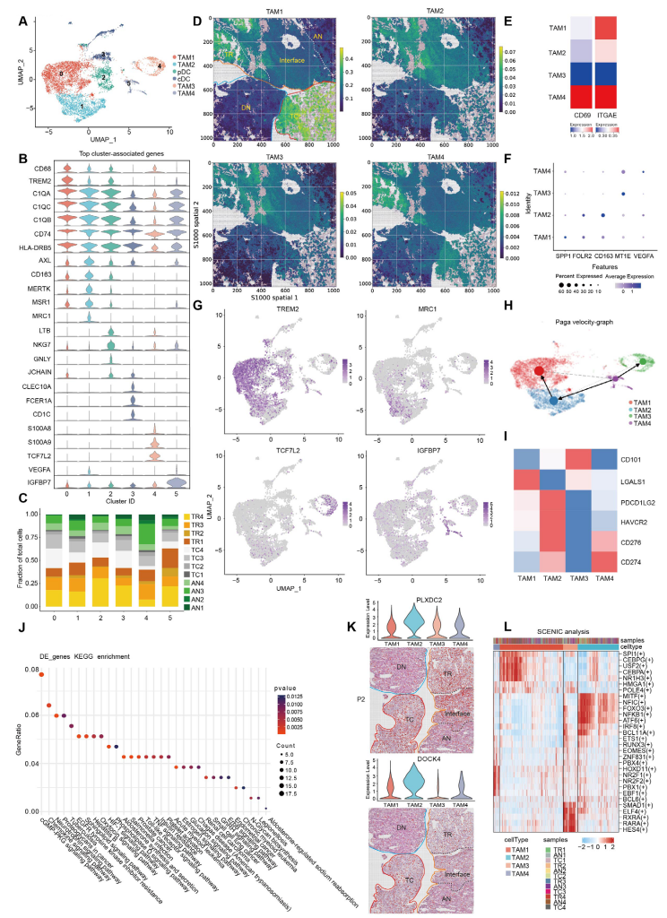 scRNA-seq數(shù)據(jù)與空間數(shù)據(jù)均顯示,4種TAM簇具有不同分布趨勢,TAM1主要分布在TC區(qū)域;TAM2高表達(dá)FOLR2、MRC1和CD163,可能是M2樣巨噬細(xì)胞且具有增強(qiáng)的免疫抑制特征,TAM4是組織駐留巨噬細(xì)胞,兩者主要分布在TR區(qū)域;TAM3表達(dá)炎癥響應(yīng)相關(guān)基因,在TR和AN區(qū)域富集。RNA速率分析顯示存在TAM4—>TAM2—>TAM1和TAM4—>TAM3兩種軌跡,以及從IF區(qū)域遷移到TC區(qū)域的趨勢。進(jìn)一步的功能分析顯示,IF區(qū)域的TAM2可能通過促進(jìn)EMT,TC區(qū)域的TAM2可能通過促進(jìn)腫瘤血管生成,起到促癌效應(yīng)。總之,TAM2不同的腫瘤促進(jìn)效應(yīng)可能與免疫抑制TME有關(guān)。