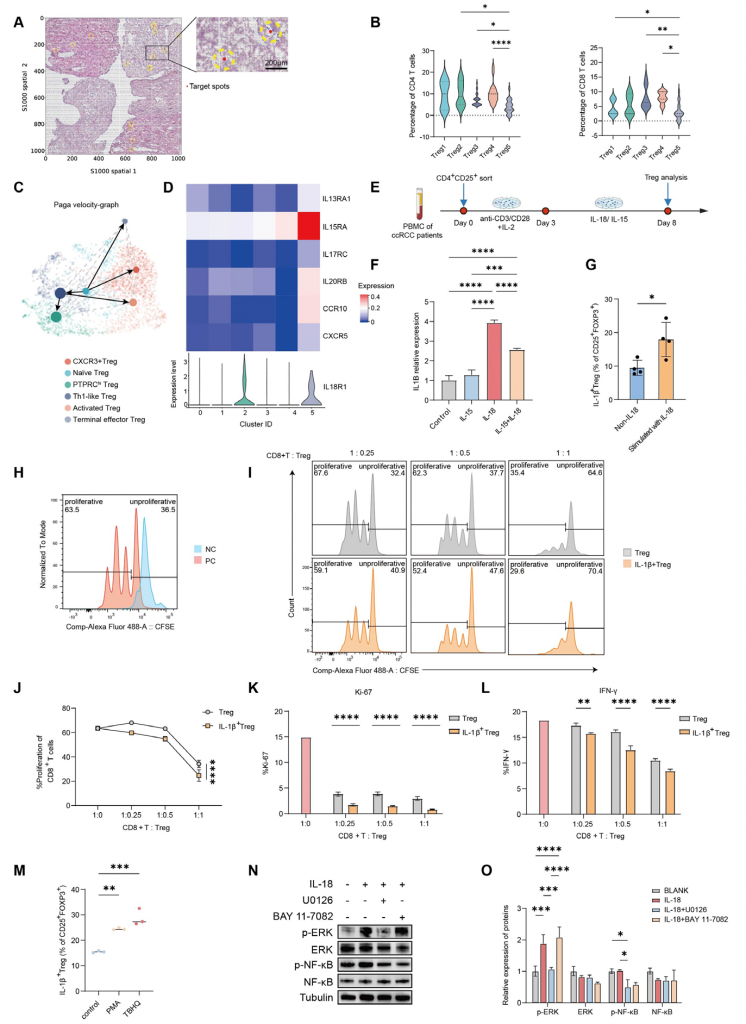 空間轉(zhuǎn)錄組數(shù)據(jù)結(jié)果顯示不同Treg細(xì)胞100μm范圍內(nèi)激活的CD4+/CD8+ T細(xì)胞數(shù)量較少,終末效應(yīng)Treg細(xì)胞100μm范圍內(nèi)CD4+/CD8+ T細(xì)胞數(shù)量更少,表明終末效應(yīng)Treg細(xì)胞周圍應(yīng)答Treg細(xì)胞(Tresp)增殖受到更強(qiáng)的抑制。細(xì)胞共培養(yǎng)實(shí)驗(yàn)表明終末效應(yīng)Treg細(xì)胞具有強(qiáng)免疫抑制功能。RNA速率分析結(jié)果表明效應(yīng)終末Treg可能由初始Treg細(xì)胞分化而來,體外實(shí)驗(yàn)表明IL-18可刺激CD4+CD25+ Treg細(xì)胞上調(diào)IL-1β表達(dá),表明終末效應(yīng)Treg細(xì)胞產(chǎn)生和作用可能與IL-18有關(guān)。ERK激活劑/NF-κB激活劑促進(jìn)IL-18+ Treg細(xì)胞的產(chǎn)生,IL-18處理后Treg細(xì)胞ERK/NF-κB磷酸化水平增加,ERK抑制劑可抑制Treg細(xì)胞表達(dá)NF-κB但NF-κB抑制劑無法抑制ERK表達(dá),綜上,這些結(jié)果表明IL-18可能通過ERK/NF-κB通路介導(dǎo)終末效應(yīng)Treg細(xì)胞的產(chǎn)生。