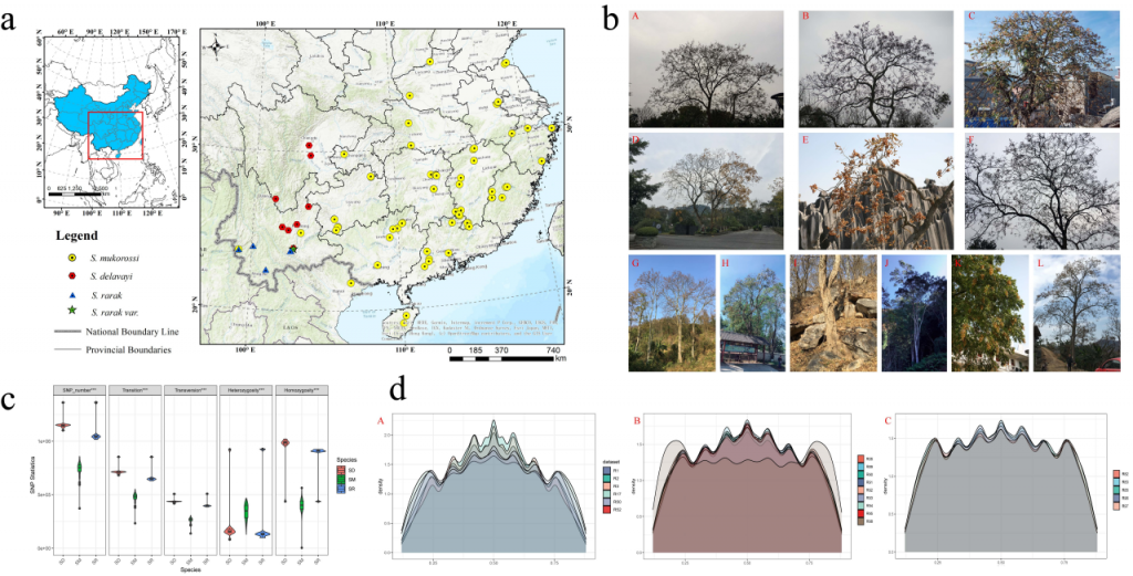 圖1?無(wú)患子屬種質(zhì)分布及單核苷酸多態(tài)性(SNP)?統(tǒng)計(jì)分析