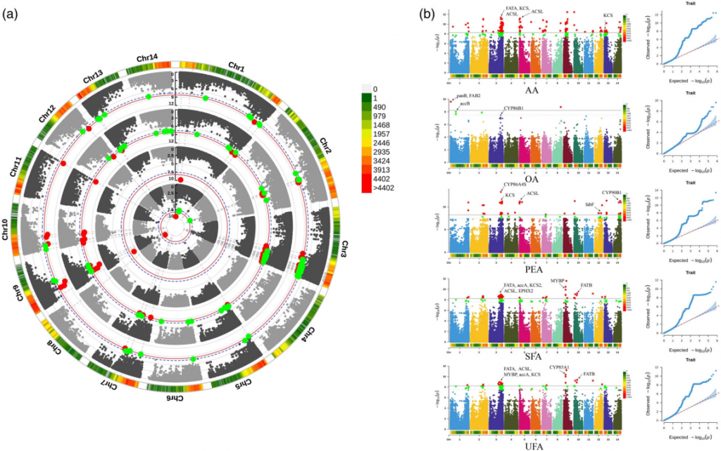 鎖定油脂合成關(guān)鍵位點(diǎn):通過(guò)全基因組關(guān)聯(lián)分析(GWAS),團(tuán)隊(duì)識(shí)別出影響種仁油脂組成的多個(gè)關(guān)鍵基因(如ACSL、FAD2、FAB2等),為高品質(zhì)油料品種的選育提供了精準(zhǔn)靶點(diǎn)。