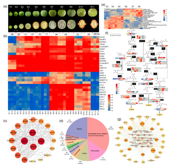 圖2-核桃果殼/內(nèi)果皮十一個(gè)發(fā)育階段基因轉(zhuǎn)錄調(diào)控網(wǎng)絡(luò)及動(dòng)態(tài)形態(tài)變化