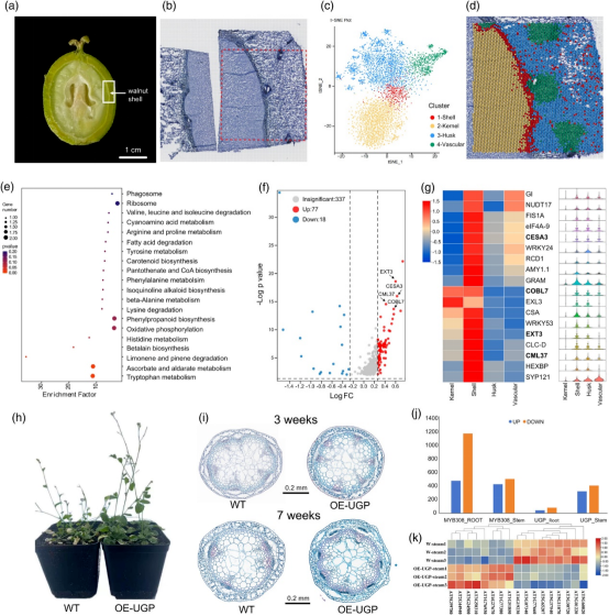 通過(guò)對(duì)十一個(gè)發(fā)育階段的轉(zhuǎn)錄組學(xué)、代謝組學(xué)、DNA甲基化和空間轉(zhuǎn)錄組學(xué)等多組學(xué)分析,揭示了多個(gè)與次生細(xì)胞生物合成和木質(zhì)素積累相關(guān)的候選基因,例如UGP、MYB308、MYB83、NAC043、NAC073、CCoAOMT1、CCoAOMT7、CHS2、CESA7、LAC7、COBL4和IRX12。在擬南芥(Arabidopsis thaliana)中過(guò)表達(dá)JrUGPJrMYB308驗(yàn)證了它們?cè)谀举|(zhì)素生物合成和細(xì)胞壁加厚中的作用。