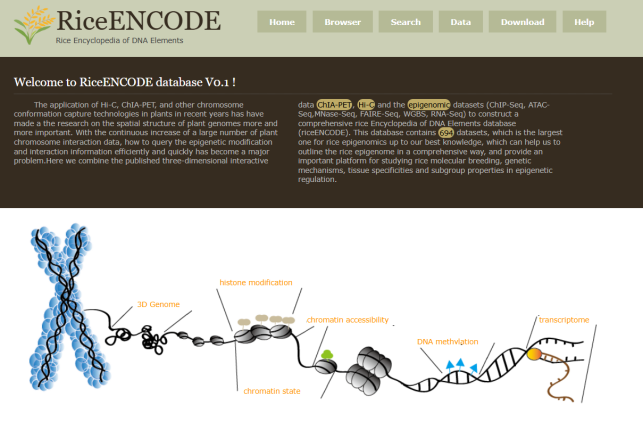 ☆?水稻多元表觀基因組數(shù)據(jù)的數(shù)據(jù)庫(kù)RiceENCODE:該數(shù)據(jù)庫(kù)收集了包括ChIP-seq,ATAC-seq, MNase-seq, FAIRE-seq, BS-seq, RNA-seq, ncRNA-seq, Hi-C和ChIA-PET?等水稻高通量數(shù)據(jù),可查詢不同品種、不同組織、不同染色體區(qū)段交互信息,兩兩基因之間交互網(wǎng)絡(luò)等。