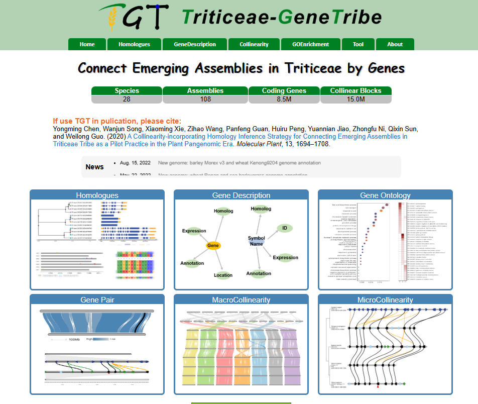 ☆?小麥族同源基因數(shù)據(jù)庫(kù)TriticeaeGeneTribe:利用小麥族物種中已發(fā)表的基因組,對(duì)不同參考基因組間同源基因鑒定,構(gòu)建了小麥族同源基因數(shù)據(jù)庫(kù)。同時(shí),數(shù)據(jù)庫(kù)具有基因功能查詢,GO富集分析,同源基因查詢,基因組區(qū)間共線性分析等功能。