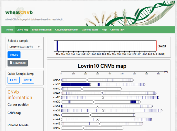 ☆?小麥WheatCNVb數(shù)據(jù)庫(kù):基于小麥CNVb新型分子標(biāo)記系統(tǒng),支持查詢小麥種質(zhì)資源的CNVb標(biāo)記,可視化CNVb指紋,并進(jìn)行基于CNVb指紋的品種比較。