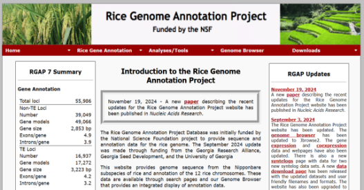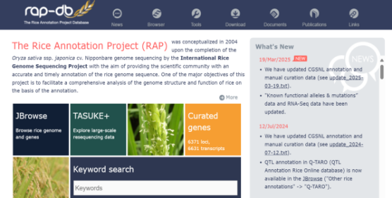 ☆?水稻基因組注釋項(xiàng)目數(shù)據(jù)庫(kù)RGAP與水稻注釋計(jì)劃RAP:旨在提供水稻日本晴基因組的序列和注釋數(shù)據(jù)。該網(wǎng)站提供基因組序列和12條水稻染色體的注釋,基因的分布,或者根據(jù)基因名稱查找基因的功能和序列、下載數(shù)據(jù)或使用blast搜索同源基因。