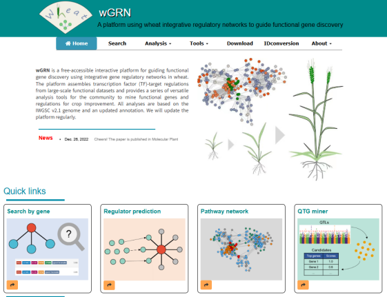 ☆?利用整合基因調(diào)控網(wǎng)絡(luò)探索小麥功能基因的交互式平臺(tái)wGRN:提供了基因調(diào)控查詢、功能基因預(yù)測(cè)和QTG挖掘等十余個(gè)功能模塊,建立了小麥整合基因調(diào)控網(wǎng)絡(luò),實(shí)現(xiàn)了可持續(xù)整合大規(guī)模調(diào)控?cái)?shù)據(jù)集的網(wǎng)絡(luò)化研究框架。