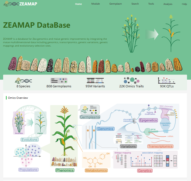 ☆?適應(yīng)玉米多組學(xué)時(shí)代的綜合數(shù)據(jù)庫(kù):整合了來自于同一玉米群體的基因組、轉(zhuǎn)錄組、表型組、代謝組、表觀基因組、遺傳變異以及遺傳定位結(jié)果等多組學(xué)數(shù)據(jù),同時(shí)收錄了多個(gè)玉米基因組,可以進(jìn)行比較基因組、共線性分析、表達(dá)聚類、遺傳變異基因分型、連鎖圖譜、定位結(jié)果、組蛋白修飾以及甲基化等多組學(xué)數(shù)據(jù)進(jìn)行檢索和分析,實(shí)現(xiàn)在不同組學(xué)數(shù)據(jù)之間進(jìn)行跳轉(zhuǎn)。