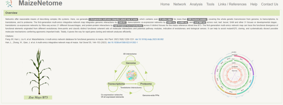 ?玉米網(wǎng)絡(luò)數(shù)據(jù)庫(kù)MaizeNetome:其中包含從基因組到轉(zhuǎn)錄組、翻譯組和蛋白質(zhì)組的整個(gè)遺傳傳遞。多組學(xué)整合網(wǎng)絡(luò)圖譜通過ChIA-PET整合基因組相互作用,包括跨根、葉、穗、?SAM和其它31個(gè)組織或發(fā)育階段mRNA-seq、circRNA-seq?的轉(zhuǎn)錄組共表達(dá)網(wǎng)絡(luò),跨?21?個(gè)不同組織/階段Ribo-seq?數(shù)據(jù),?B73?材料8?個(gè)不同組織的酵母雜交蛋數(shù)據(jù)。數(shù)據(jù)庫(kù)可以幫助輔助QTL定位,并系統(tǒng)剖析農(nóng)藝性狀的可能分子機(jī)制,為快速基因克隆和高效的網(wǎng)絡(luò)分析鋪平道路。