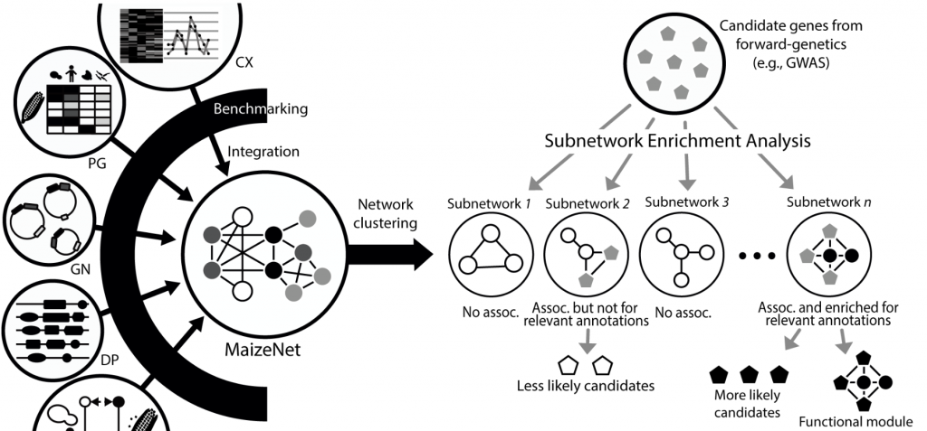 ☆?全基因組范圍的玉米基因輔助功能網(wǎng)絡(luò)數(shù)據(jù)庫(kù)MaizeNet:是通過集成?21?個(gè)組件網(wǎng)絡(luò)構(gòu)建的,其中每個(gè)網(wǎng)絡(luò)都是從不同的組學(xué)數(shù)據(jù)中推斷出來的。 通過整合異構(gòu)數(shù)據(jù),MaizeNet?提供了玉米遺傳結(jié)構(gòu)的全面視圖,為特定生物過程確定候選基因的優(yōu)先級(jí)??梢岳?MaizeNet?中實(shí)現(xiàn)的優(yōu)先級(jí)服務(wù)來生成新的功能假設(shè),縮小候選基因的范圍,并確定該功能的新基因。