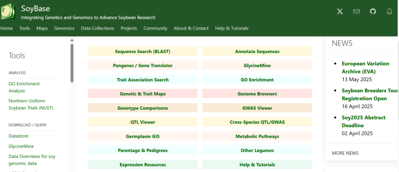 ☆?大豆基因組學(xué)和分子生物學(xué)數(shù)據(jù)庫(kù):為大豆研究者提供了大量的數(shù)據(jù)和工具,以支持大豆的遺傳學(xué)、基因組學(xué)和育種研究。用戶可以通過SoyBase查找大豆的基因組信息、遺傳資源、表型數(shù)據(jù)等,并利用其中的分析工具進(jìn)行數(shù)據(jù)挖掘和可視化。