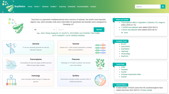 ?大豆多組學(xué)數(shù)據(jù)庫(kù)SoyOmics:從基因組、變異組、轉(zhuǎn)錄組、表型組等不同層面整合了大豆相關(guān)數(shù)據(jù)集,實(shí)現(xiàn)了不同層次組學(xué)數(shù)據(jù)的交互查詢和聯(lián)合比較分析。數(shù)據(jù)庫(kù)目前收錄了多個(gè)大豆品系的基因組組裝,注釋數(shù)據(jù),以高質(zhì)量的ZH13作為參考基因組,對(duì)2898份材料的全基因組測(cè)序數(shù)據(jù)進(jìn)行了全基因組序列變異檢測(cè),鑒定到約3800萬(wàn)條SNP/INDEL變異數(shù)據(jù),提供了來自大豆泛基因組分析的約55萬(wàn)條結(jié)構(gòu)變異數(shù)據(jù)以及基于結(jié)構(gòu)變異構(gòu)建的圖泛基因組。收錄了多個(gè)品系不同組織時(shí)期的表達(dá)數(shù)據(jù)。數(shù)據(jù)庫(kù)針對(duì)115個(gè)表型多年多點(diǎn)測(cè)定的約2.7萬(wàn)條表型記錄進(jìn)行了本體注釋和歸類,并將表型數(shù)據(jù)與變異數(shù)據(jù)進(jìn)行關(guān)聯(lián)。除以上組學(xué)數(shù)據(jù)外,數(shù)據(jù)庫(kù)同時(shí)提供了甲基化測(cè)序數(shù)據(jù),Soy40K大豆芯片數(shù)據(jù)。