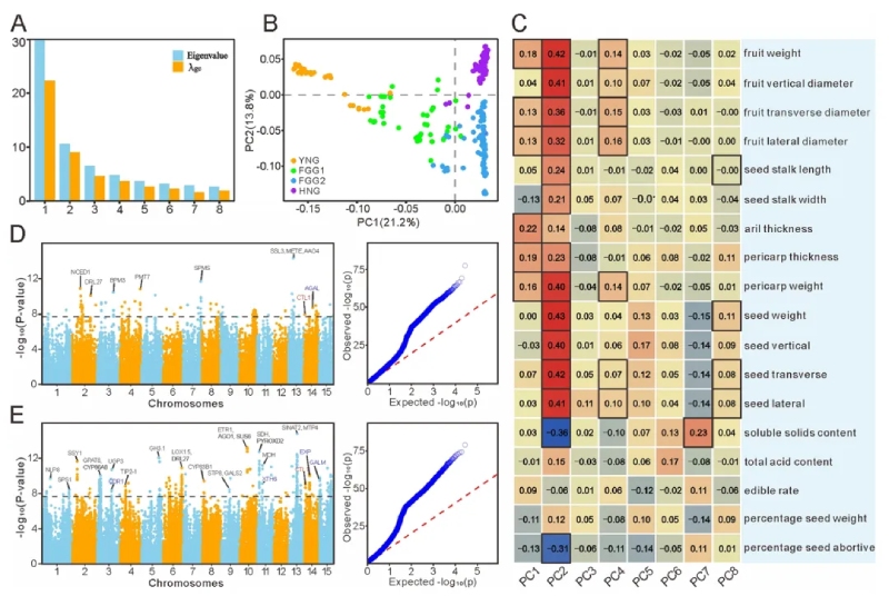 綜上所述,該研究揭示了荔枝的遺傳多樣性和群體結構,通過全面的基因組分析和表型分析,闡明了果實品質的遺傳基礎。這些發(fā)現(xiàn)為理解荔枝果實品質的遺傳基礎提供了寶貴資源和知識,為進一步的遺傳改良貢獻了理論基礎。