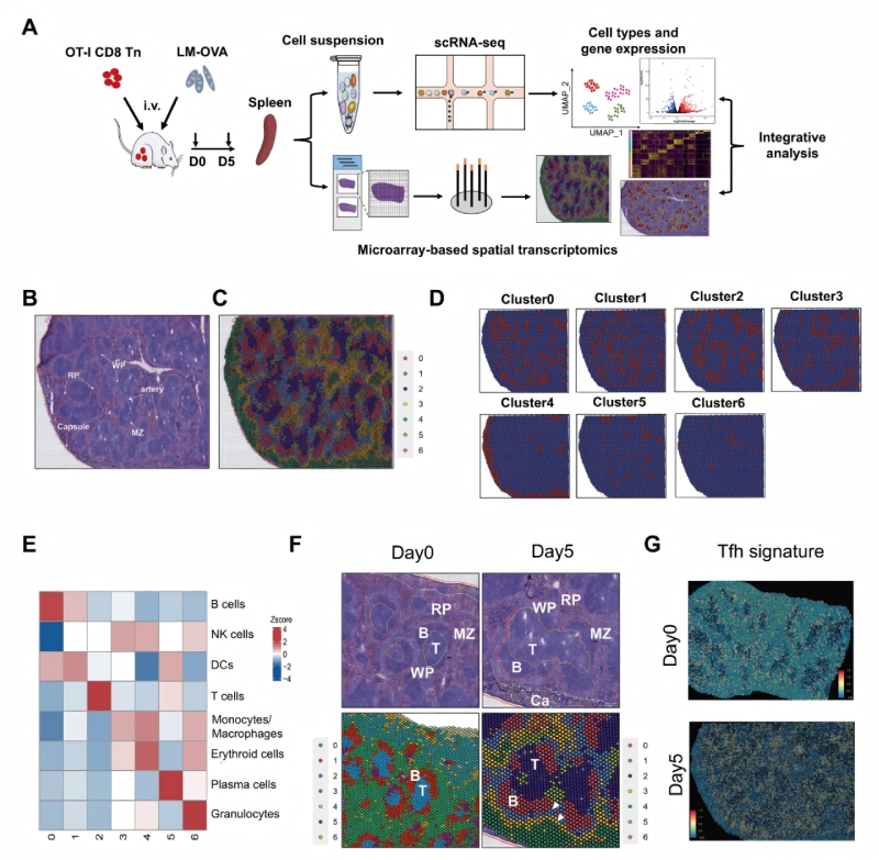 為了研究免疫反應過程中不同免疫細胞的空間分布和CD8+?T細胞分化的調節(jié)機制,研究人員通過整合單細胞RNA測序(scRNA-seq)和BMKMANU?S1000空間轉錄組(ST)技術,分析了急性感染模型中脾臟免疫細胞的空間分布與CD8??T細胞分化機制。實驗采用OT-I轉基因小鼠模型,通過李斯特菌(LM-OVA)感染誘導免疫反應,關鍵發(fā)現(xiàn)包括:1)脾臟形成7個功能集群(B細胞、T細胞、單核/巨噬細胞等);2)感染后T/B細胞區(qū)擴大,APCs(B細胞、DC、巨噬細胞)在T細胞區(qū)外圍聚集;3)空間重組與T細胞分化(MP/TE亞群)顯著相關。多組學整合揭示了免疫微環(huán)境的動態(tài)調控機制,為理解感染中細胞互作提供了多組學視角。