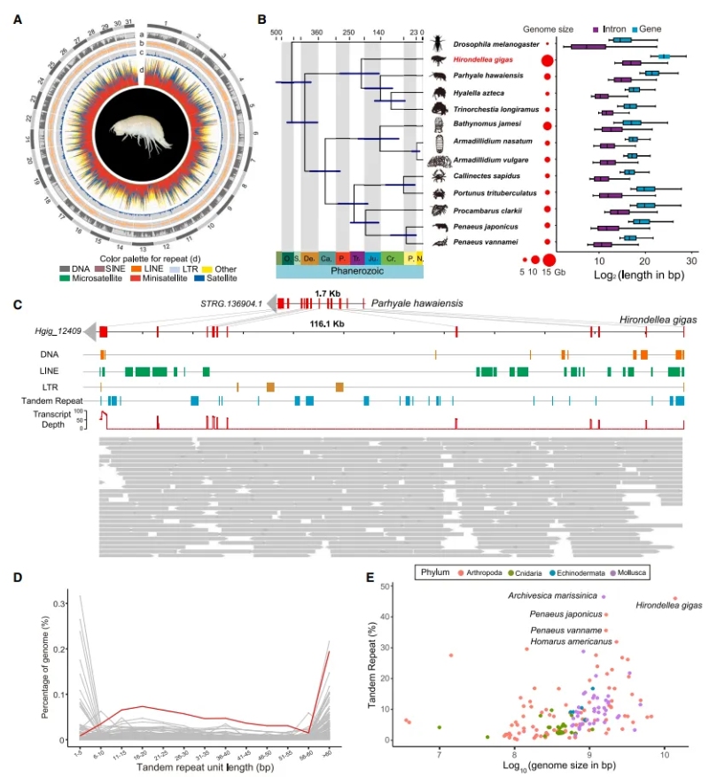研究團隊利用PacBio?HiFi長讀長測序和Hi-C三維基因組技術(shù),成功組裝了H.?gigas的染色體水平的高質(zhì)量基因組(大小13.92?Gb)?;蚪M分析揭示了其兩大主要特征:內(nèi)含子延長和重復(fù)序列擴張。與近緣物種相比,H.?gigas的內(nèi)含子長度顯著增加,主要是由于重復(fù)序列的插入,尤其是串聯(lián)重復(fù)和長散在重復(fù)序列(LINEs)轉(zhuǎn)座子。H.?gigas基因組中71.98%為重復(fù)序列,主要為串聯(lián)重復(fù),占到基因組的46.03%,顯著高于其他無脊椎動物。特別是,與其他無脊椎動物基因組相比,H.?gigas基因組中長單元串聯(lián)重復(fù)序列(小衛(wèi)星,10-100?bp)的比例更高,其比例與無脊椎動物基因組大小正相關(guān)。這些重復(fù)的產(chǎn)生可能與深淵極端環(huán)境的適應(yīng)有關(guān)。