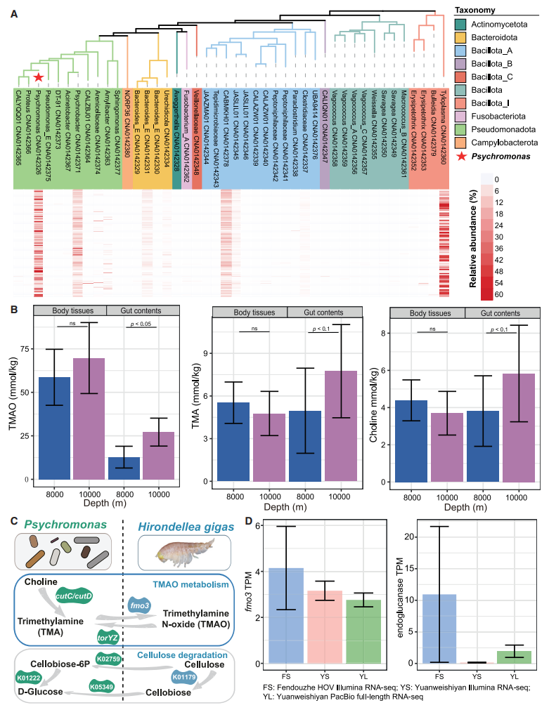 氧化三甲胺(TMAO)是一種滲透調(diào)節(jié)物質(zhì),在滲透壓調(diào)節(jié)以及在高靜水壓條件下維持細胞完整性方面發(fā)揮著重要作用。檢測發(fā)現(xiàn),隨著深度增加,鉤蝦腸道內(nèi)容物中TMAO濃度顯著升高,體組織中也呈現(xiàn)類似趨勢。鉤蝦自身編碼fmo3基因,可將三甲胺(TMA)轉(zhuǎn)化為TMAO。而其優(yōu)勢共生菌Psychomonas的基因組中攜帶cutC和cutD基因簇,可將膽堿分解為TMA;同時擁有torYZ操縱子,可以將TMAO還原為TMA,從而調(diào)控宿主體內(nèi)的TMAO濃度,形成動態(tài)平衡。