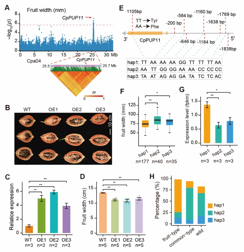 圖1. CpPUP11決定番木瓜果實(shí)寬度