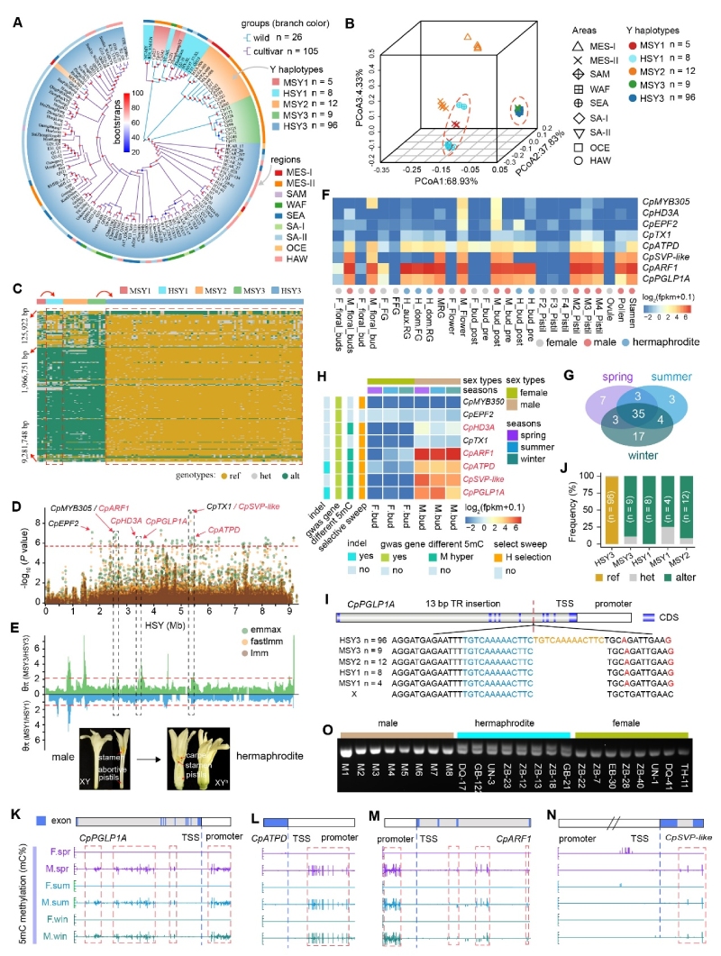 這種性別轉(zhuǎn)換是由針對(duì)雄性偏好基因的選擇驅(qū)動(dòng)的,并在Yh連鎖區(qū)域中定位了一個(gè)與性別轉(zhuǎn)換密切相關(guān)13?bp串聯(lián)重復(fù)結(jié)構(gòu)變異(HSY3-TR-13bp)。該兩性株特異性變異位于雄性偏好基因CpPGLP1A中,且被HSY3群體選擇固定(圖3)。