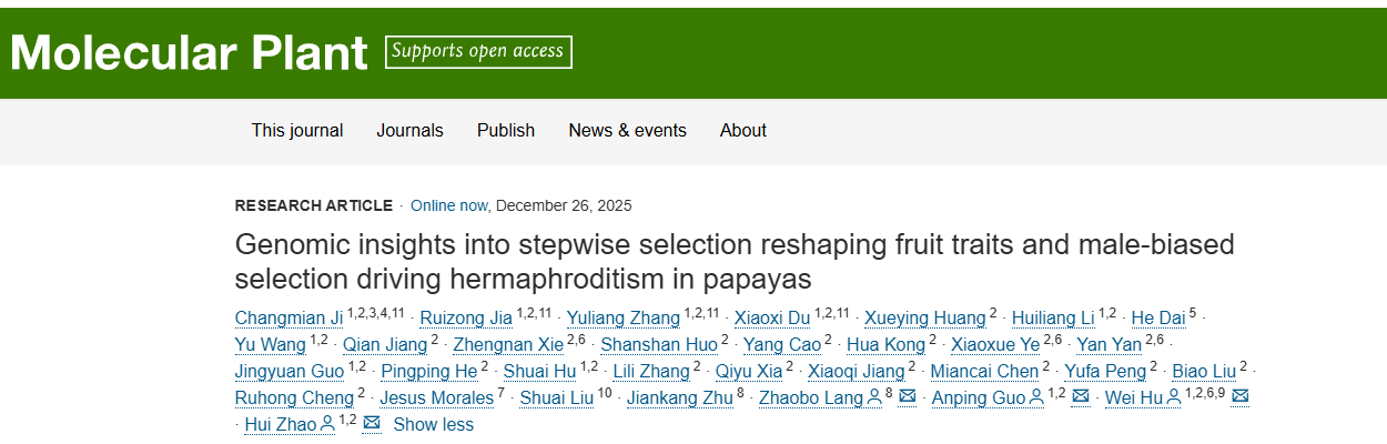 2025年12月23日,中國(guó)熱科院生物所、熱帶作物生物育種全國(guó)重點(diǎn)實(shí)驗(yàn)室聯(lián)合南方科技大學(xué)、中科院分子植物科學(xué)卓越創(chuàng)新中心、中國(guó)科學(xué)院大學(xué)、熱科院椰子所、Nature?Source?Improved?Plants,?Mexico和百邁客生物等國(guó)內(nèi)外科研單位在中科院1區(qū)Top期刊Molecular?Plant(影響因子:24.1)發(fā)表了題為“Genomic?insights?into?stepwise?selection?reshaping?fruit?traits?and?male-biased?selection?driving?hermaphroditism?in?papayas”的最新研究論文,其中百邁客生物生信工程師戴鶴為該論文共同作者。