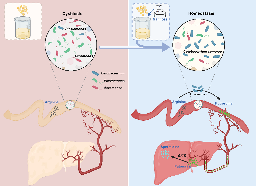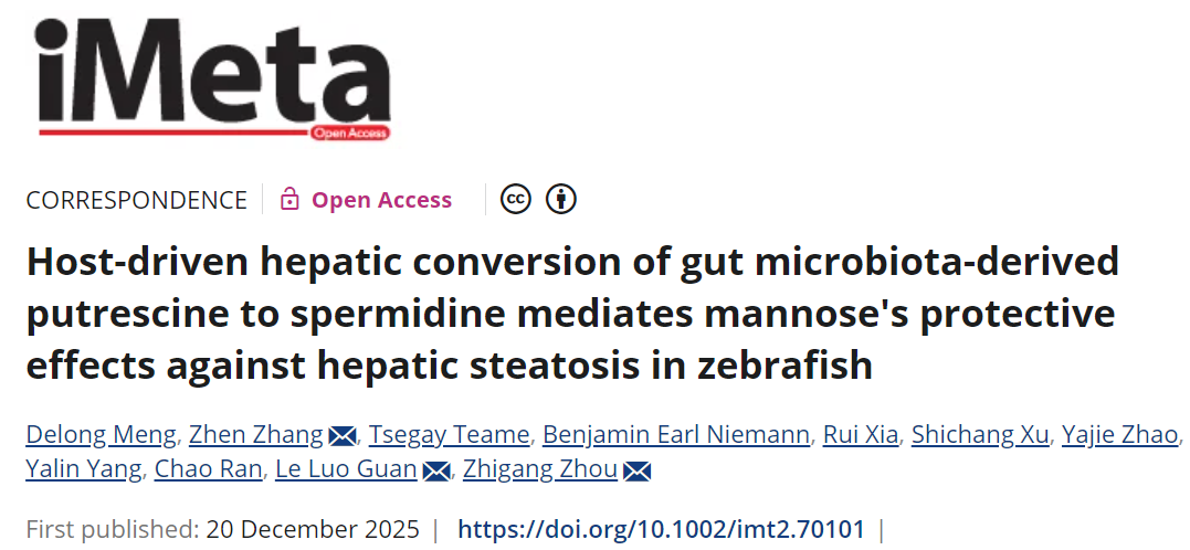 2025年12月20日,中國農業(yè)科學院飼料研究所周志剛團隊在iMeta在線發(fā)表研究論文,題為“Host-driven?hepatic?conversion?of?gut?microbiota-derived?putrescine?to?spermidine?mediates?mannose’s?protective?effects?against?hepatic?steatosis?in?zebrafish”。