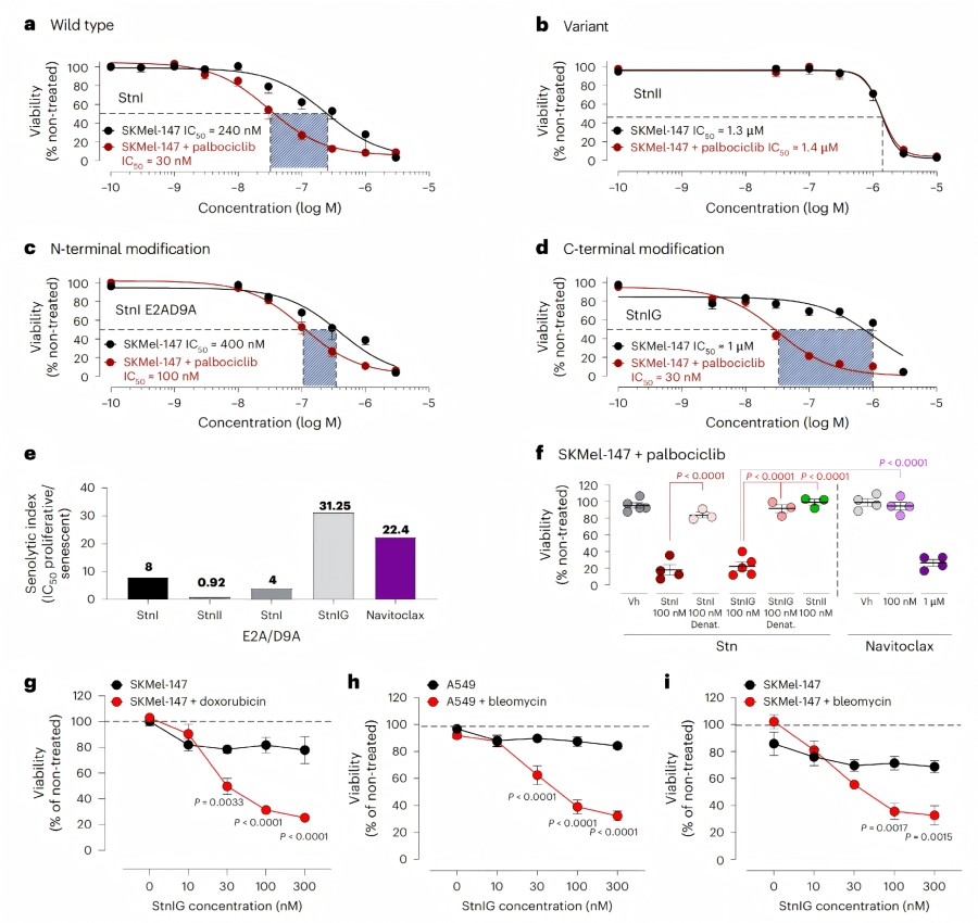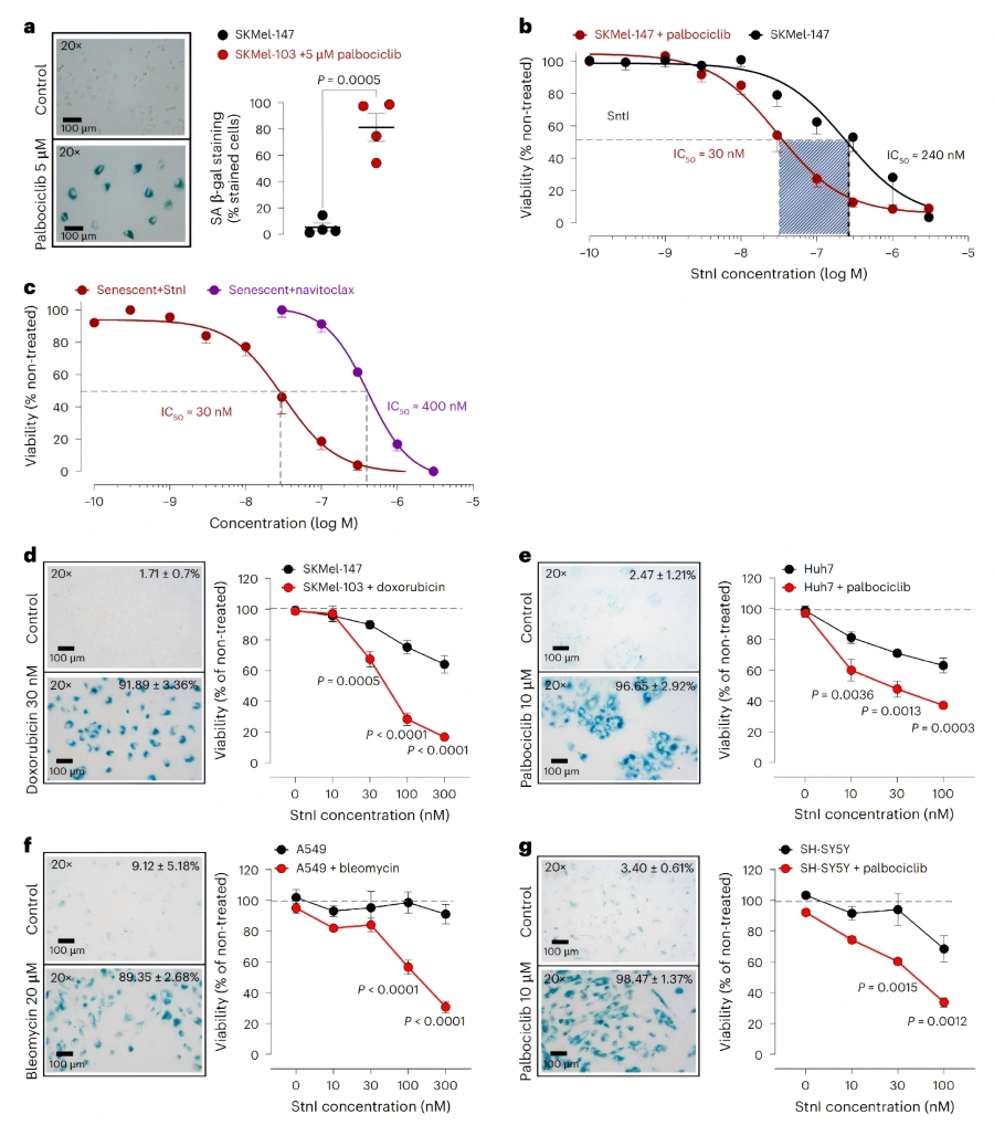 濃度與時(shí)間依賴性:StnI(0.1?nM-3?μM)對(duì)衰老SKMel-147細(xì)胞的viability具有濃度依賴性抑制作用,增殖細(xì)胞的IC??約為240nM,而palbociclib處理的衰老細(xì)胞IC??約為30?nM,衰老溶解指數(shù)為8。低濃度StnI(10-30?nM)的作用具有時(shí)間依賴性,延長(zhǎng)暴露時(shí)間可增強(qiáng)衰老溶解效果。