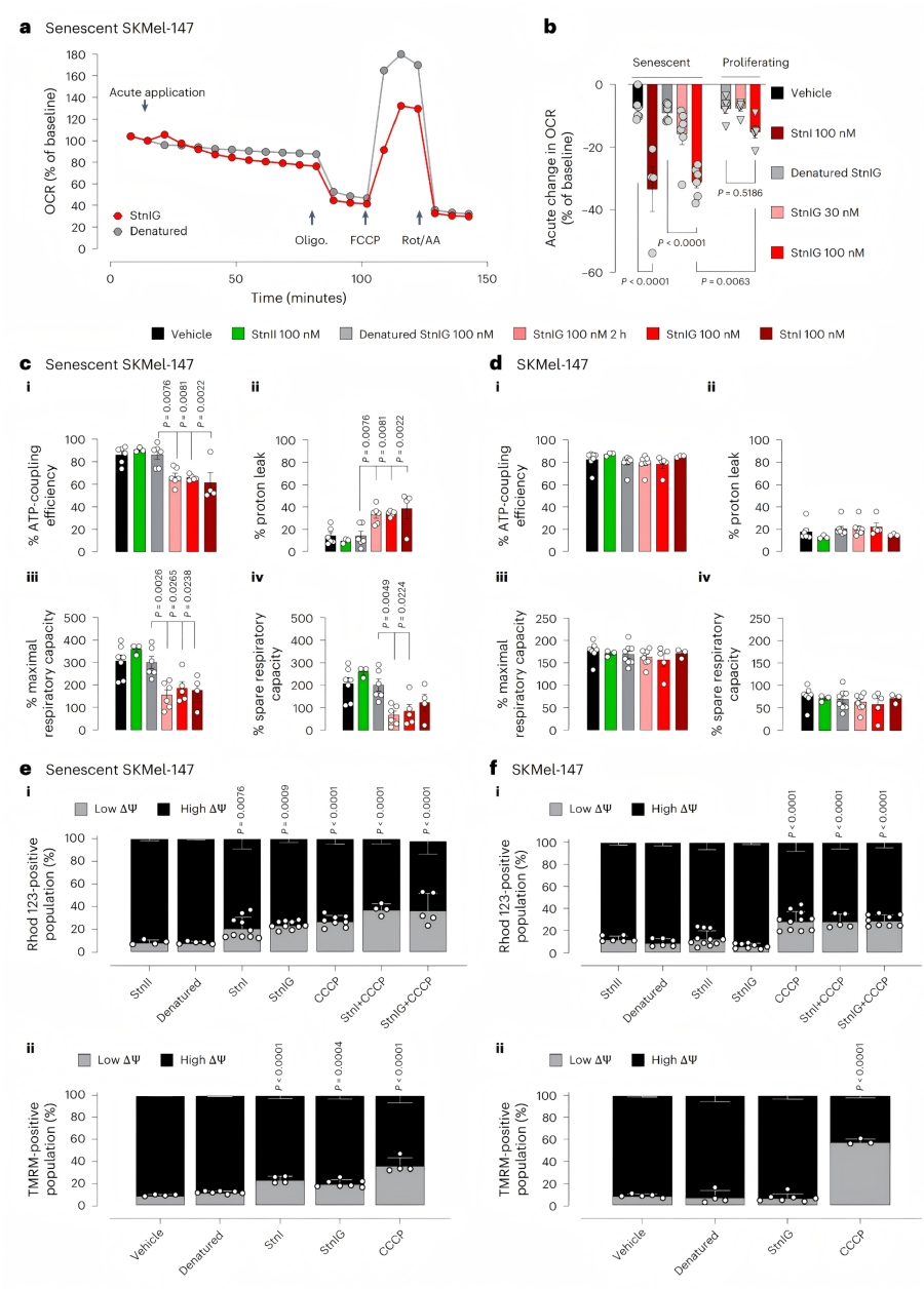 線粒體功能損傷:StnI和StnIG處理后,衰老細(xì)胞的線粒體呼吸在15分鐘內(nèi)短暫升高,隨后持續(xù)下降(StnI組降低33.5%±7%,StnIG組降低31.1%±2%),而變性StnIG無(wú)此效果。增殖細(xì)胞經(jīng)StnIG處理后,基礎(chǔ)呼吸僅降低15.1%±2%,遠(yuǎn)低于衰老細(xì)胞。衰老細(xì)胞的線粒體膜電位去極化,ATP偶聯(lián)效率、最大呼吸能力和備用呼吸容量均顯著降低,且持續(xù)24小時(shí)以上,伴隨凋亡增加(Annexin?V陽(yáng)性細(xì)胞比例升高)。