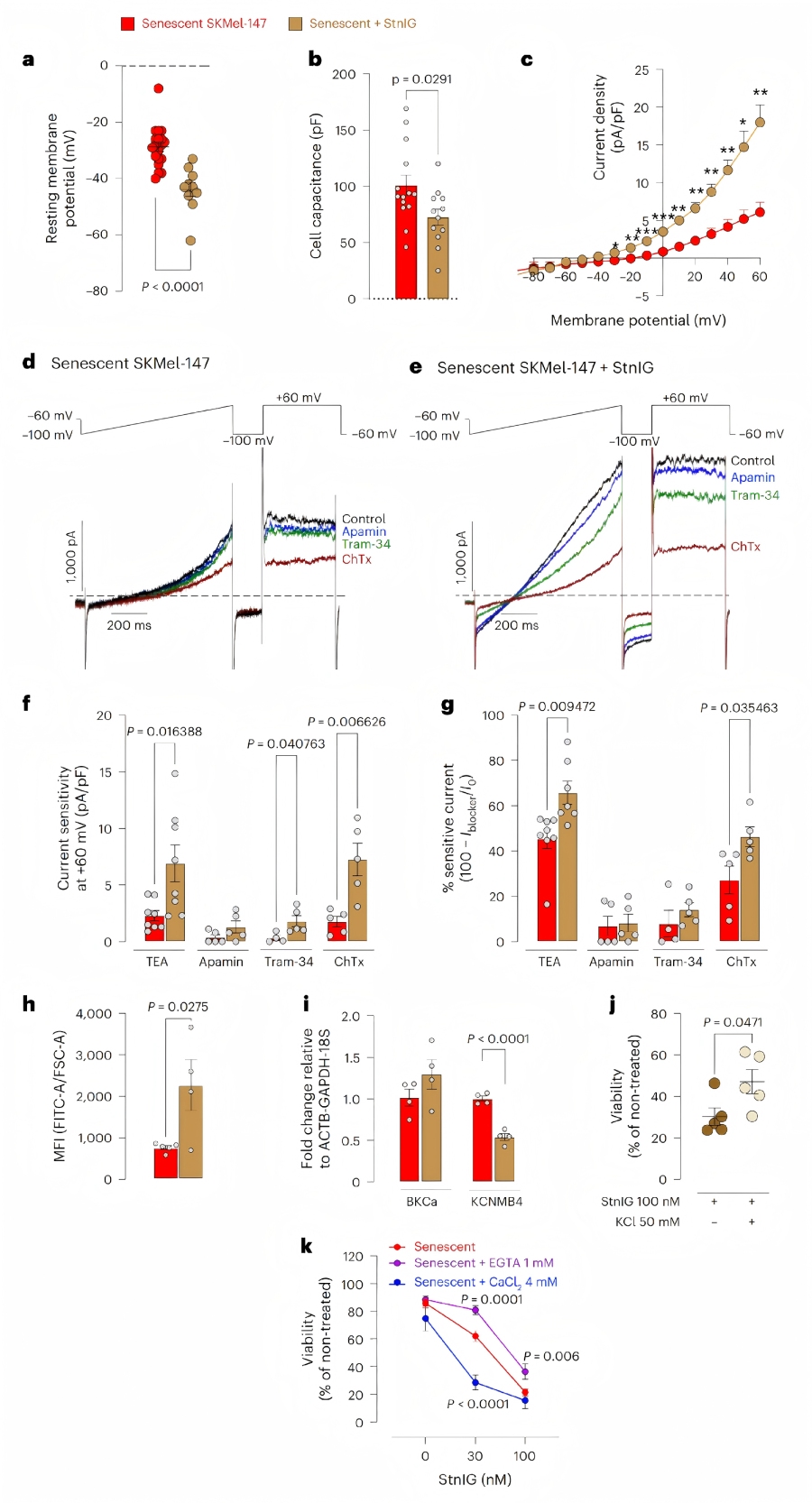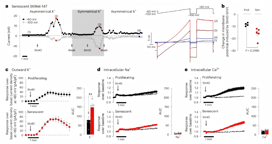 離子平衡紊亂:膜片鉗分析顯示,衰老細(xì)胞的細(xì)胞膜去極化,鉀通道(主要為鈣激活鉀通道KCa)密度降低。StnIG處理后,衰老細(xì)胞出現(xiàn)持續(xù)的鉀外流、鈉內(nèi)流和鈣內(nèi)流,細(xì)胞膜超極化。其中,鈣內(nèi)流主要來(lái)自細(xì)胞外,且可激活KCa通道(尤其是BKCa和IKCa亞型),進(jìn)一步促進(jìn)鉀外流,導(dǎo)致細(xì)胞體積減小。