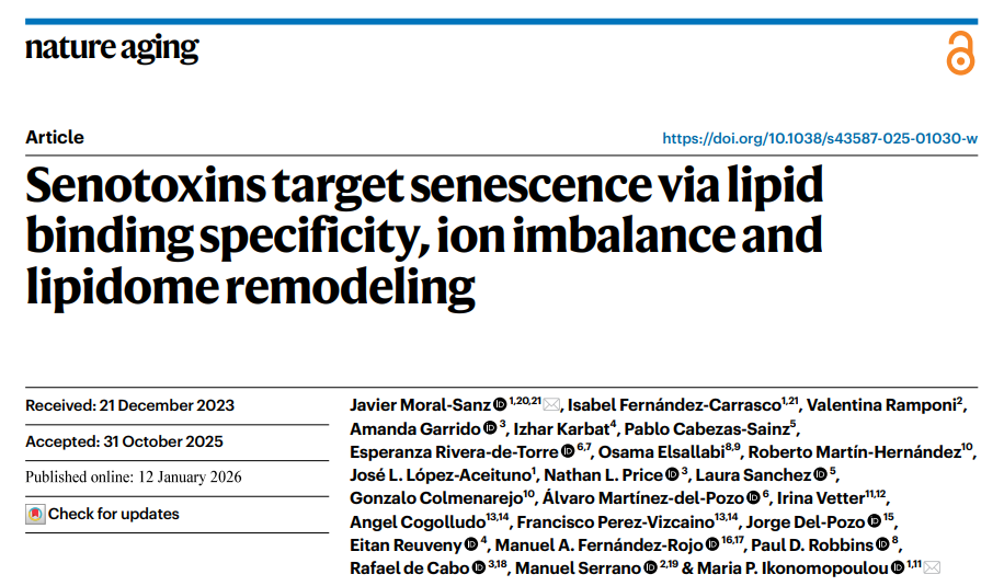 2026年1月12日,西班牙馬德里營(yíng)養(yǎng)高級(jí)研究所Javier?Moral-Sanz和Maria?P.?Ikonomopoulou在Nature?Aging(IF=19.4)發(fā)表題為“Senotoxins?target?senescence?via?lipid?binding?specificity,?ion?imbalance?and?lipidome?remodeling”的研究文章。