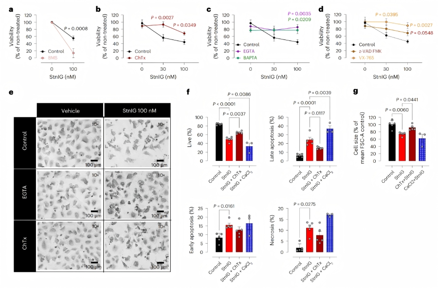 鈣依賴性細(xì)胞死亡:StnIG處理后,衰老細(xì)胞內(nèi)鈣水平持續(xù)升高,下調(diào)BKCa通道調(diào)節(jié)亞基KCNMB4,增強(qiáng)BKCa通道活性。使用鈣螯合劑(EGTA、BAPTA)或?BKCa通道阻滯劑(charybdotoxin)可顯著削弱StnIG的衰老溶解效果,表明鈣內(nèi)流和BKCa激活是細(xì)胞死亡的關(guān)鍵環(huán)節(jié)。