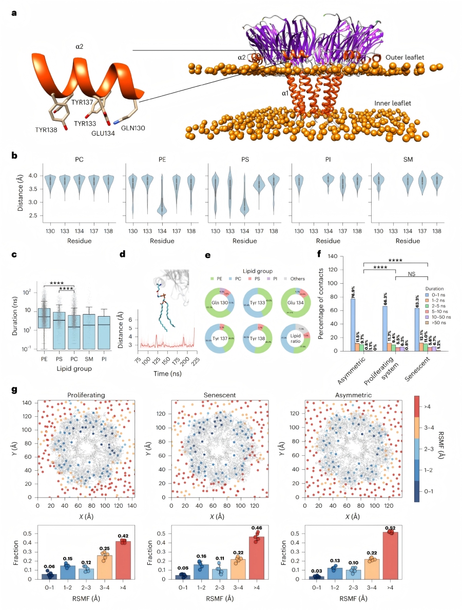 分子結(jié)合機(jī)制:基于同源蛋白FraC的晶體結(jié)構(gòu)建模顯示,StnIG的α2螺旋(膜結(jié)合區(qū))含關(guān)鍵殘基Gln130、Tyr133、Glu134等,其中Glu134和Gln130可與?PE、PS脂質(zhì)的頭部基團(tuán)形成穩(wěn)定氫鍵(結(jié)合距離<3??),且結(jié)合持續(xù)時(shí)間顯著長(zhǎng)于與其他脂質(zhì)的相互作用。健康細(xì)胞中PE、PS位于細(xì)胞膜內(nèi)葉,而衰老細(xì)胞的膜不對(duì)稱性破壞,PE、PS暴露于外葉,為StnIG提供特異性結(jié)合位點(diǎn)。