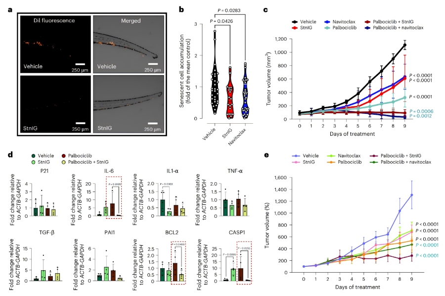 小鼠異種移植模型:在SKMel-147黑色素瘤和Huh7肝癌小鼠異種移植模型中,palbociclib(100?mg/kg,口服)聯(lián)合StnIG(2?mg/kg,腹腔注射,每48小時(shí)一次)治療,腫瘤體積顯著縮小,療效與palbociclib聯(lián)合navitoclax(50?mg/kg,口服)相當(dāng)。腫瘤組織中SA-β-半乳糖苷酶活性降低,SASP相關(guān)基因(IL-6、BCL2、CASP1)表達(dá)顯著下調(diào)。