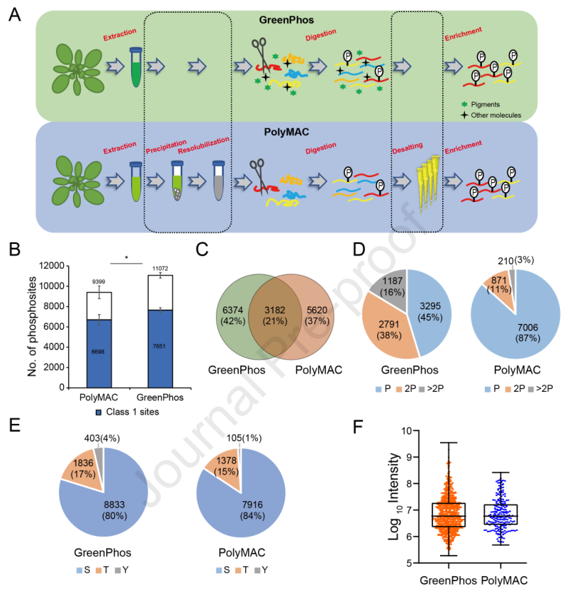 2023年11月27日,中國科學(xué)院遺傳與發(fā)育生物學(xué)研究所汪迎春團(tuán)隊在Molecular Plant在線發(fā)表了題為GreenPhos, a universal method for in-depth measurement of plant phosphoproteomes with high quantitative reproducibility?的研究論文。論文中報道了一種具有突破性的植物磷酸化蛋白質(zhì)組學(xué)新技術(shù)。該技術(shù)采用了簡化、穩(wěn)健的工作流程,有效地克服了植物磷酸化蛋白質(zhì)組分析的主要技術(shù)難點,能高靈敏度、高特異性快速地富集植物磷酸肽。利用該技術(shù)可定量分析不同植物的磷酸蛋白質(zhì)組,其分析深度之深、定量重復(fù)性之高前所未有,有望成為植物磷酸蛋白組學(xué)的通用技術(shù)。由于該技術(shù)主要面向高等植物及其它綠色生物(如衣藻),且操作簡便,極大地降低了實驗所需的人力和試劑費用,因此命名為GreenPhos (綠磷)。