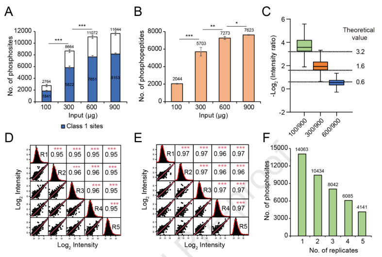 為了評估GreenPhos在定量磷酸化蛋白質(zhì)組學(xué)中的潛力,作者了鑒定的磷酸化肽與上機(jī)量之間的定量關(guān)系。以900μg為參照,在100、300和600μg中,檢測到的磷酸肽強(qiáng)度比與參考中磷酸肽強(qiáng)度比的中位數(shù)與理論值具有很好的相關(guān)性(圖3C)。分析結(jié)果表明,GreenPhos與單次LC-MS結(jié)合可用于從高達(dá)600μg的蛋白質(zhì)中定量磷酸肽,準(zhǔn)確度高。通過5次重復(fù)質(zhì)譜分析,評價了GreenPhos在植物磷蛋白組定量鑒定中的再現(xiàn)性。5個生物重復(fù)和5個技術(shù)重復(fù)的磷酸肽強(qiáng)度的Pearson相關(guān)系數(shù)平均分別為0.95和0.97 (圖3D和3E),表明具有較高的定量可重復(fù)性。從5個生物重復(fù)中共鑒定出磷酸化位點14063個,其中74%的磷酸化位點至少在2個重復(fù)中鑒定出 (圖3F)。結(jié)果表明,GreenPhos可以在定量和定性上產(chǎn)生高度可重復(fù)性的結(jié)果。