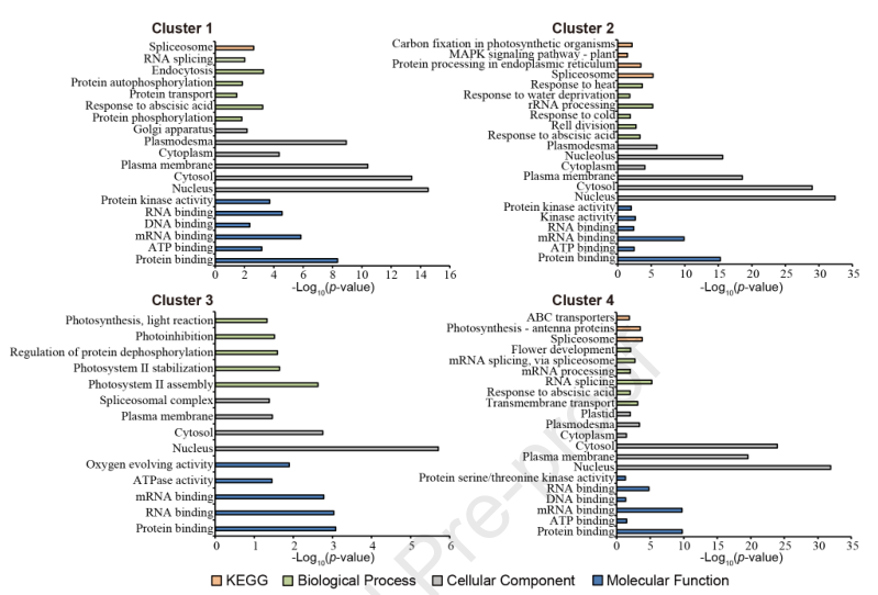 使用Fisher’s-exact對每個簇中的磷酸化蛋白進(jìn)行GO和KEGG富集分析(圖5)。與報道一致,在細(xì)胞組分條目,細(xì)胞核、細(xì)胞質(zhì)和細(xì)胞膜蛋白在所有簇中被顯著富集。在分子功能條目,激酶活性在簇1、2和4中富集,而在簇3中不富集,但是蛋白質(zhì)去磷酸化的在生物過程條目在簇3中富集。結(jié)果表明,激酶的磷酸化激活和磷酸酶的去磷酸化是鹽脅迫誘導(dǎo)的重要反應(yīng)。