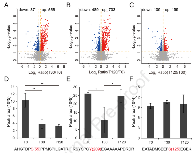 為了深入了解擬南芥對鹽脅迫響應(yīng)中蛋白磷酸化介導(dǎo)的信號,作者使用GreenPhos和單次LC-MS檢測,分析了100 mM NaCl處理30分鐘(T30)和120分鐘(T120)或未處理(T0)的擬南芥幼苗的磷酸化蛋白質(zhì)組學(xué)(圖4A)。每個處理包括3個生物學(xué)重復(fù),每個重復(fù)600μg蛋白用于磷酸肽的富集??偣矎?316個磷酸化蛋白中鑒定出12908個磷酸肽,含有15889個磷酸化位點。在磷酸肽中,13473個磷酸位點在處理的至少一個重復(fù)中包含可量化的信息。
