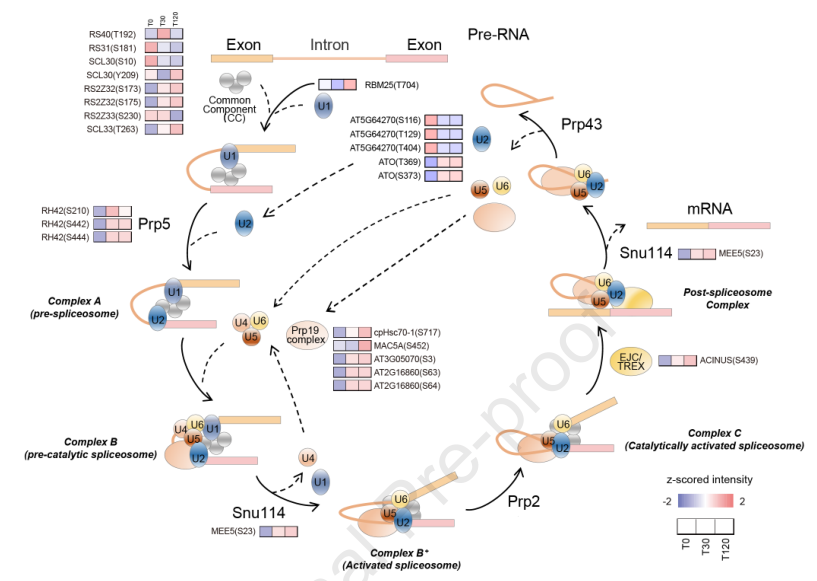 除了激酶外,在簇1、2和4中剪接體被KEGG通路顯著富集 (圖5),暗示磷酸化調(diào)控mRNA的可變剪接,是植物響應(yīng)脅迫的關(guān)鍵過程。在鹽脅迫下,18個剪接體蛋白上共有28個不同的位點被差異磷酸化 (圖7)。利用PRM進(jìn)一步驗證了Y209在SCL30上的差異磷酸化(圖6)。據(jù)報道,RNA解旋酶及其磷酸化對剪接體的組裝至關(guān)重要。在鹽脅迫30分鐘后,Prp5的S210、S442和S444位點磷酸化增加,并在120分鐘后保持高水平,Prp19的多個亞基也觀察到類似的磷酸化模式(圖7)。盡管這些差異磷酸化事件的意義尚未得到明確的證明,但它們可能參與了鹽脅迫誘導(dǎo)的mRNA剪接的調(diào)控。