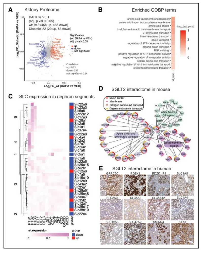 圖2-綜合蛋白質(zhì)組/相互作用組分析表明SGLT2i對腎臟代謝產(chǎn)物轉(zhuǎn)運(yùn)的廣泛重塑