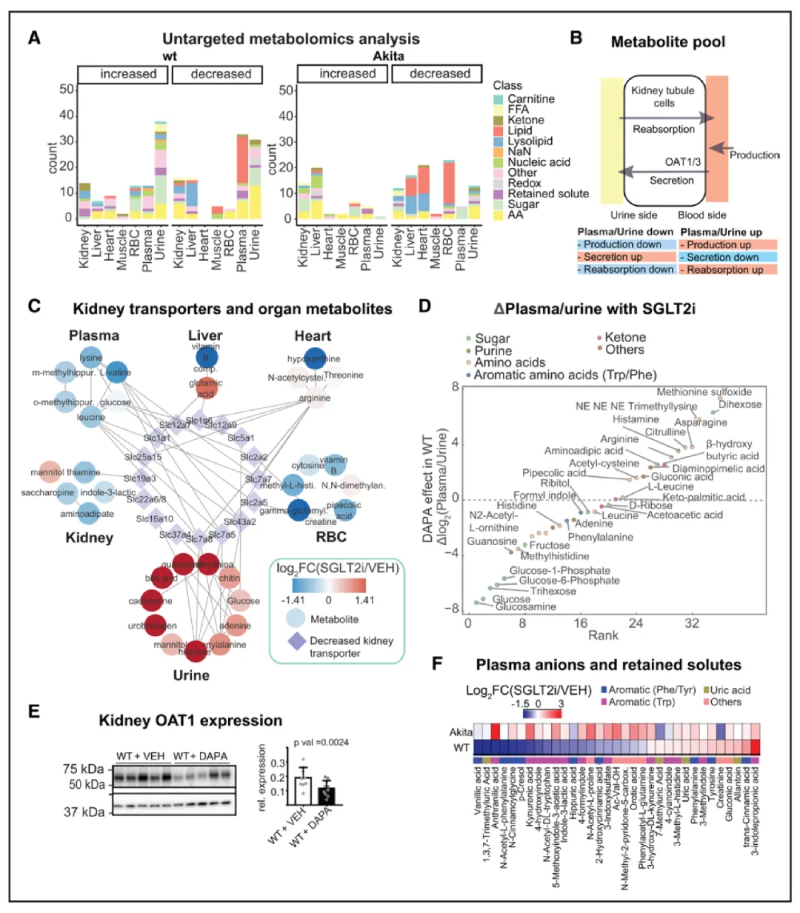 丹麥奧胡斯大學(xué)學(xué)者在Circulation雜志上發(fā)表題為“Metabolic Communication by SGLT2 Inhibition“研究論文,研究團(tuán)隊使用Akita小鼠模型和臨床隊列樣品,通過整合宏基因組、代謝組、蛋白組等多組學(xué)數(shù)據(jù),確定了SGLT2i對腎臟、心臟、血管和其他器官的幾種SGLT2依賴性效應(yīng)和脫靶效應(yīng),通過重構(gòu)腎臟代謝物轉(zhuǎn)運(yùn)和全身代謝通訊,發(fā)揮心腎保護(hù)作用。提供了關(guān)于SGLT2相互作用因子和SGLT2i依賴性蛋白質(zhì)組、代謝組、磷酸化蛋白質(zhì)組和宏蛋白質(zhì)組的新見解,從而為SGLT2i新型和早期機(jī)制靶標(biāo)提供了潛在的路線,促進(jìn)代謝藥物的開發(fā)。