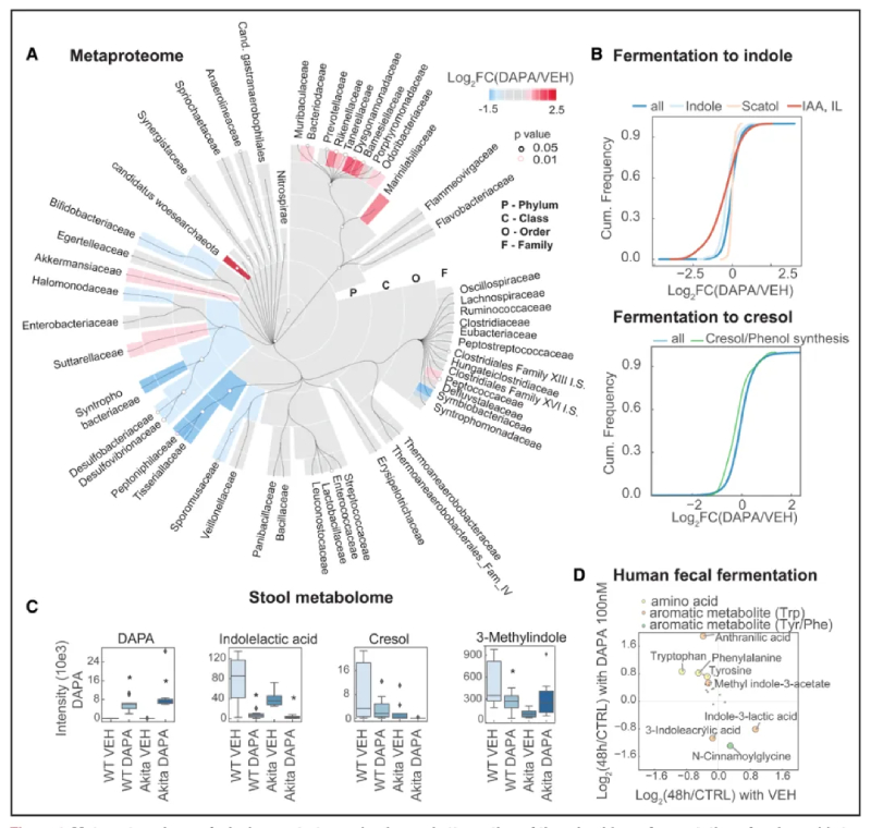 由于WT小鼠中SGLT2i改變的許多血漿溶質(zhì)是芳香族氨基酸的代謝物,因此分析了可以在蛋白質(zhì)組水平上代謝這些氨基酸的細(xì)菌的豐度。對于產(chǎn)生吲哚的細(xì)菌,發(fā)現(xiàn)表達(dá)色氨酸酶以從色氨酸產(chǎn)生吲哚的物種減少(吲哚丙烯酸;圖4B)。