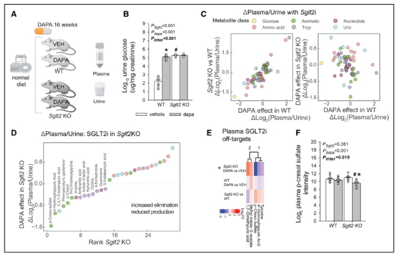在SGLT2 KO和WT小鼠中,許多代謝物的比率發(fā)生了類似的變化,就像在WT小鼠中使用達(dá)格列凈和溶劑處理一樣(圖5C左圖),這表明SGLT2抑制的后果。在其他方面,葡萄糖比率的下降,反映了尿糖排泄的增加。正如預(yù)期的那樣,SGLT2的缺失阻斷了達(dá)格列凈對葡萄糖排泄的影響(圖5C右圖)。另一方面,達(dá)格列凈顯著改變了SGLT2 KO小鼠體內(nèi)許多代謝物的比例,表明了一種偏離靶點的效應(yīng)(圖5D)。血漿:尿液比例的排名變化顯示,達(dá)格列凈降低了SGLT2 KO小鼠中多種芳香酸代謝物的比例,包括甲酚和馬尿酸鹽,其次是色氨酸代謝物。血漿水平分析確定了SGLT2i在SGLT2 KO環(huán)境中顯著改變的5種代謝物,包括PCL硫酸鹽和一種修飾的馬尿酸(圖5E和5F)。該實驗表明SGLT2i治療具有非靶點效應(yīng),包括對甲酚、馬尿酸鹽和色氨酸代謝物。