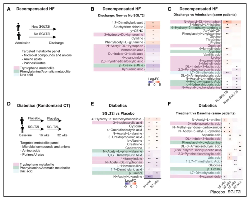 鑒于腎臟SGLT2相互作用組以及微生物對SGLT2i的反應(yīng)在小鼠和人類中相似,我們想知道SGLT2i是否會影響循環(huán)中的溶質(zhì),在縱向數(shù)據(jù)中與心血管相關(guān)。對來自2個獨立研究的患者的血漿樣本進(jìn)行了靶向代謝組分析,目標(biāo)是80個有機(jī)陰離子和尿毒癥毒素。在第一組>40名患者中,在失代償性心衰的真實環(huán)境中分析了這種影響(圖6A)。結(jié)果表明,SGLT2i顯著降低或鈍化了心力衰竭患者血漿中幾種有機(jī)陰離子的增加,但僅當(dāng)住院期間添加SGLT2i時(圖6B和6C)。包括幾種色氨酸代謝物,如ILA、犬尿酸和乙酰色氨酸,以及苯丙氨酸代謝物苯乙酰谷氨酰胺和PCL硫酸鹽。分析了在糖尿病患者中使用SGLT2I(依帕列凈)的隨機(jī)對照試驗的縱向數(shù)據(jù)(圖6D)。與基線和安慰劑相比,二甲基尿酸和三甲基尿酸的血漿濃度降低,PCL降低,吲哚代謝物增加緩慢(圖6E和6F)。在兩項臨床研究中,降低的溶質(zhì)大部分來自嘌呤代謝和腸道芳香氨基酸代謝,這與在小鼠身上觀察到的代謝器官一致。