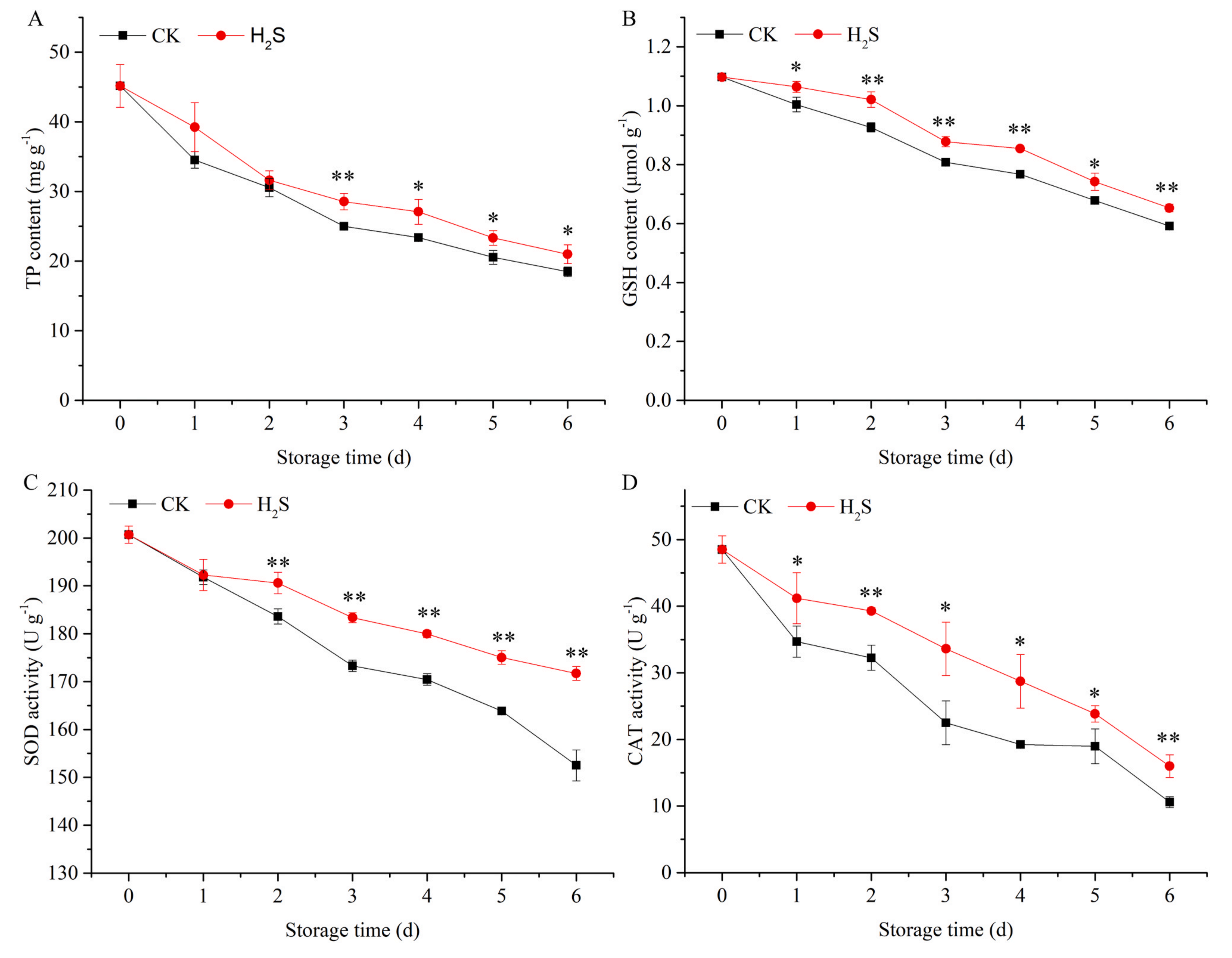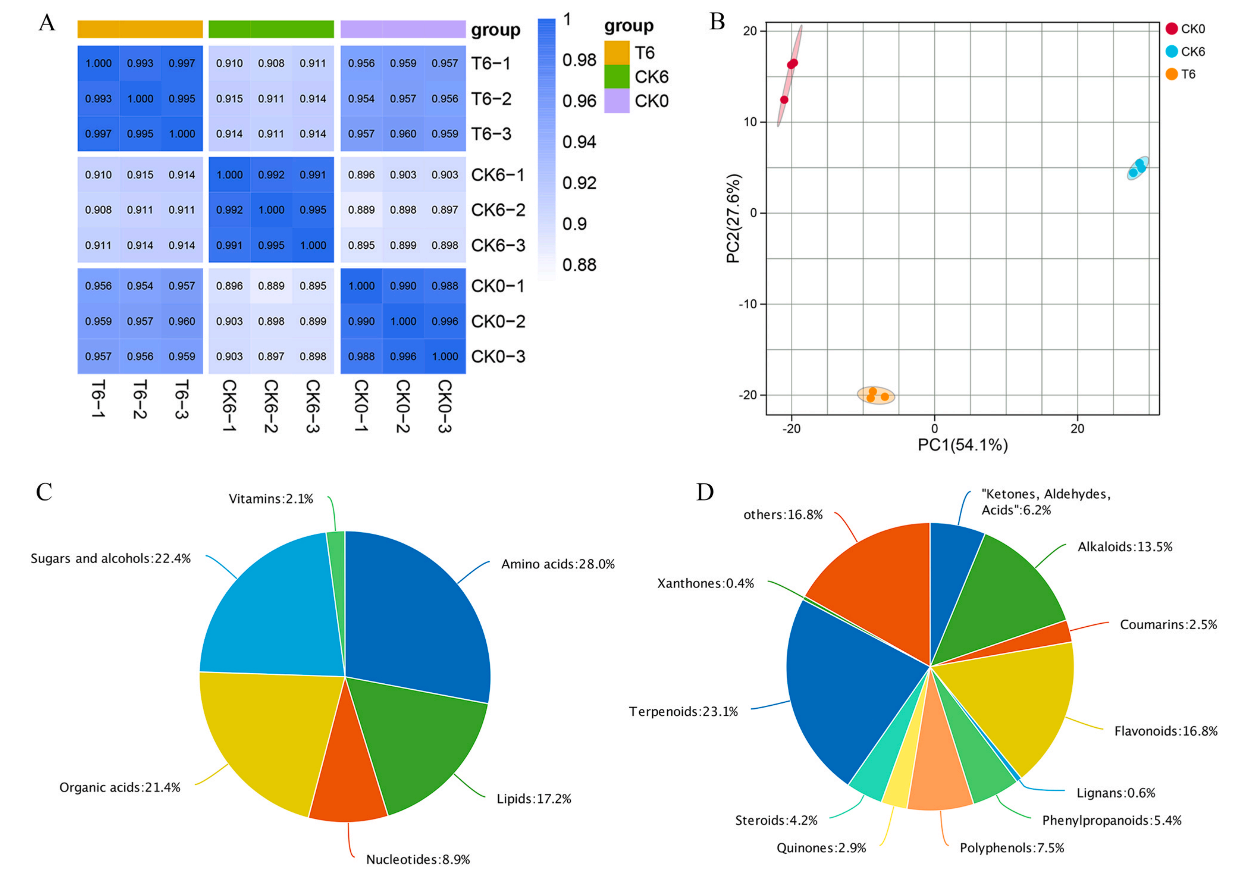 丙二醛通常被認(rèn)為是植物脂質(zhì)過氧化的生物標(biāo)志物。為了監(jiān)測切片芋頭褐變過程中膜脂過氧化情況,測定了LOX活性和MDA含量。隨著時間的推移,LOX活性和MDA含量隨著褐變繼續(xù)進(jìn)行逐漸升高 (圖7B, C)。這些結(jié)果表明,在褐變過程中,膜脂過氧化加劇。此外,相關(guān)分析顯示,LOX活性、MDA含量和其他褐變指標(biāo)之間存在很強(qiáng)的相關(guān)性?(圖7D)。這些結(jié)果進(jìn)一步支持了膜脂過氧化和/或代謝參與芋頭褐變。