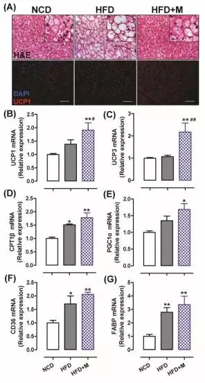 1)?通過棕色脂肪組織(BAT)石蠟切片分析,發(fā)現(xiàn)HFD促進脂質積累(切片白化),而褪黑素表現(xiàn)出相反的作用,并且褪黑素促進BAT中UCP1蛋白的表達,如下圖A。