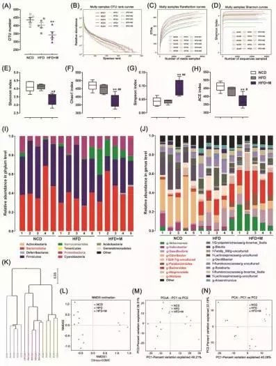 4)?UPGMA、NMDS、PCA、PCoA分析,發(fā)現(xiàn)褪黑素顯著改變了腸道菌群的結構,如下圖K-N。