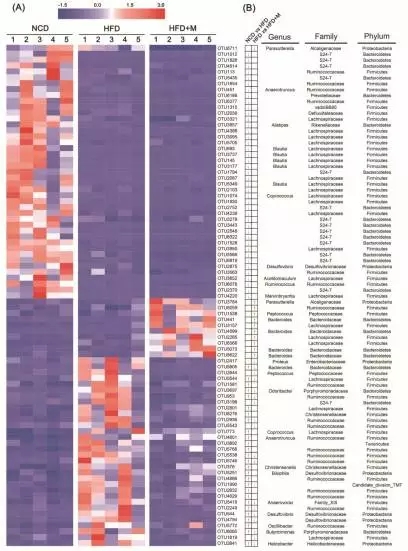 1) ?如下圖顯示,在三個分組中一共找到85個相對豐度有顯著差異的OUT。與NCD組相比,HFD組有27個相對豐度顯著增高的OTU,42個顯著降低的OTU。與HFD組相比,添加了褪黑素的組有10個相對豐度顯著增高的OTU,20個顯著降低的OTU;而在這30個差異性的OTU中,有14個OTU的變化方向與和NCD組比較的結果完全相反。這14個OTU屬于Ruminococcaceae、Desulfovibrionaceae、Bacteroides、Porphyromonadaceae、Helicobacteraceae、Christensenellaceae,有研究表明這些微生物與肥胖相關。