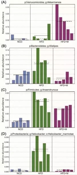 2) LEfSe分析,發(fā)現(xiàn)褪黑素顯著提高Akkermansia的相對豐度,Akkermansia即是降低高脂肪膳食小鼠體重的有益菌。而褪黑素顯著降低Alistipes、Anaerotruncus、Helicobacter?marmotae的相對豐度,則這三種細菌預防肥胖的有害菌。總之,褪黑素能夠使高脂肪膳食小鼠的腸道菌群由失調狀態(tài)轉為正常狀態(tài),從而抑制體重的增加。